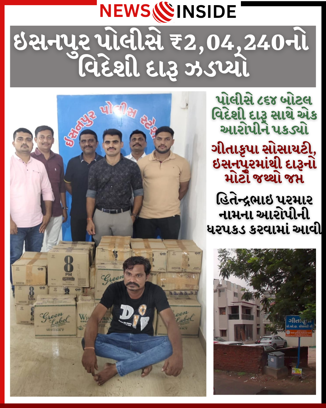 ૩૦/૦૬/૨૦૨૫ ના રોજ, ઇસનપુર, અમદાવાદ શહેરના ગીતાકૃપા સોસાયટીમાંથી બાતમી મળતા પોલીસે દરોડો પાડ્યો હતો. પોલીસે જુદી જુદી બ્રાન્ડની ૮૬૪ વિદેશી દારૂની બોટલો પકડી હતી, જેની કુલ કિંમત Rs.૨,૦૪,૨૪૦/- છે.