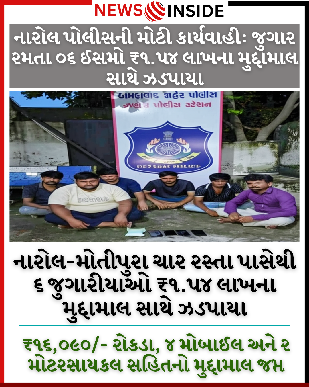 અમદાવાદ શહેર – અમદાવાદ શહેર પોલીસ કમિશ્નરશ્રીની સૂચના અનુસાર, શહેરમાં ચાલી રહેલી ગેરકાયદેસર દારૂ અને જુગારની પ્રવૃત્તિઓ ડામવા માટે નારોલ પોલીસ સ્ટેશનની સર્વેલન્સ ટીમે સઘન કાર્યવાહી હાથ ધરી છે. આ ઝુંબેશના ભાગરૂપે, નારોલ-મોતીપુરા ચાર રસ્તા પાસે આવેલા વિનસ ફેક્ટરી સામેથી જાહેરમાં જુગાર રમતા ૦૬ ઈસમોને ઝડપી પાડવામાં આવ્યા છે.