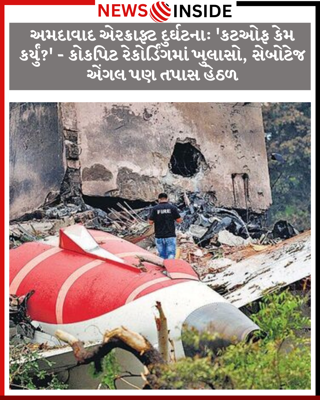 અમદાવાદ, 12 જુલાઈ 2025 – અમદાવાદના સરદાર વલ્લભભાઈ પટેલ આંતરરાષ્ટ્રીય એરપોર્ટ પરથી લંડન ગેટવિક જવા માટે ટેકઓફ કર્યાના માત્ર 30 સેકન્ડમાં જ એર ઈન્ડિયાની ફ્લાઈટ AI-171 બી.જે. મેડિકલ કોલેજના હોસ્ટેલ વિસ્તારમાં ક્રેશ થતા 241 મુસાફરો અને ક્રૂ મેમ્બર્સ સહિત 270થી વધુ લોકોના મોત થયા. આ દુર્ઘટનામાં ચમત્કારિક રીતે બચનાર એકમાત્ર મુસાફર વિશ્વાશકુમાર રમેશ છે. આજે, દુર્ઘટનાના એક મહિના પછી, એરક્રાફ્ટ એક્સિડેન્ટ ઇન્વેસ્ટિગેશન બ્યુરો (AAIB) દ્વારા પ્રાથમિક રિપોર્ટ રજૂ કરવામાં આવ્યો છે, જે કેટલાક ચોંકાવનારા ખુલાસાઓ કરે છે.
