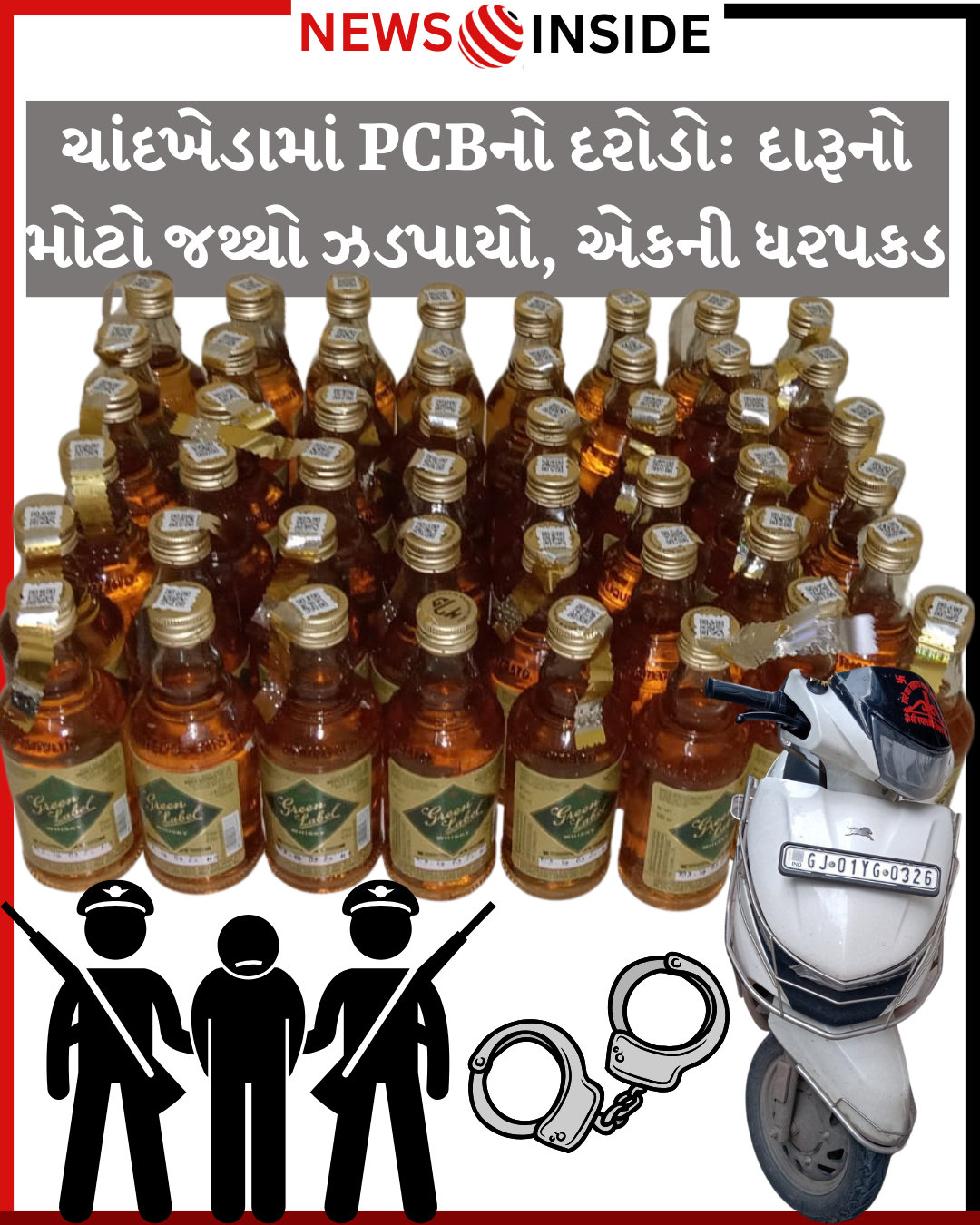 પોલીસે એક જ્યુપીટર સ્કૂટર (નંબર GJ-01-YG-0326) ને રોક્યું હતું. તપાસ કરતા, સ્કૂટરમાંથી ભારતમાં બનેલા વિદેશી દારૂની ૧૮૦ મિલીની ૪૮ સીલબંધ બોટલો મળી આવી હતી. આ દારૂની કિંમત આશરે રૂ. ૧૨,૬૭૨/- થાય છે. આ ઉપરાંત, દારૂ લાવવા માટે વપરાયેલું જ્યુપીટર સ્કૂટર પણ જપ્ત કરવામાં આવ્યું હતું, જેની કિંમત રૂ. ૮૦,૦૦૦/- છે.