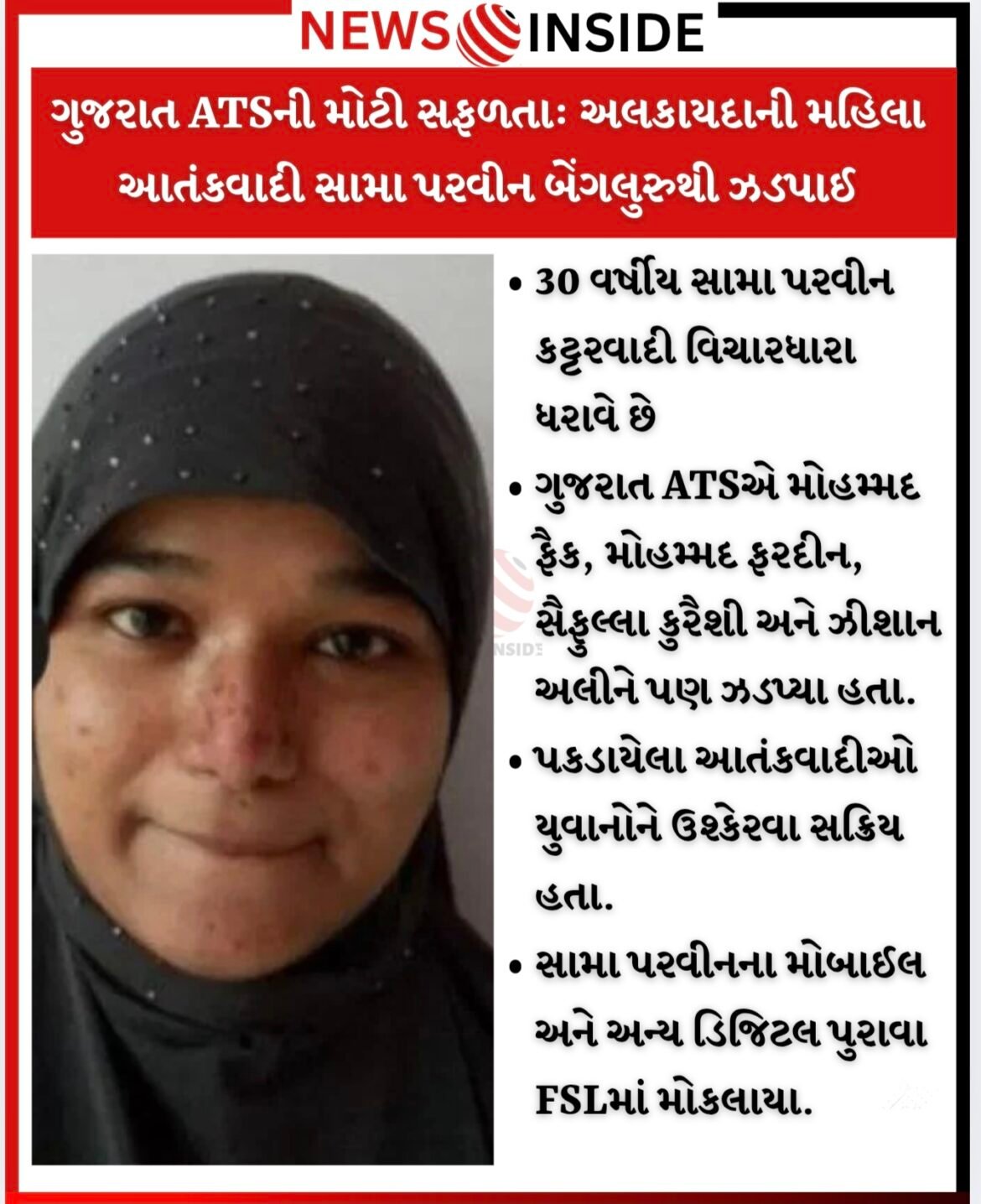 ગુજરાત એન્ટી ટેરરિસ્ટ સ્ક્વોડ (ATS) એ આતંકવાદ વિરુદ્ધની લડાઈમાં વધુ એક મોટી સફળતા હાંસલ કરી છે. અલકાયદા ઇન ઇન્ડિયન સબકોન્ટિનેન્ટ (AQIS) સાથે સંકળાયેલી 30 વર્ષીય મહિલા આતંકવાદી સામા પરવીનની બેંગલુરુથી ધરપકડ કરવામાં આવી છે. આ મહિલા અલકાયદાના ઓનલાઈન આતંકી મોડ્યૂલની મુખ્ય ષડયંત્રકારી હોવાનું અને અત્યંત કટ્ટરવાદી વિચારધારા ધરાવતી હોવાનું માનવામાં આવે છે.