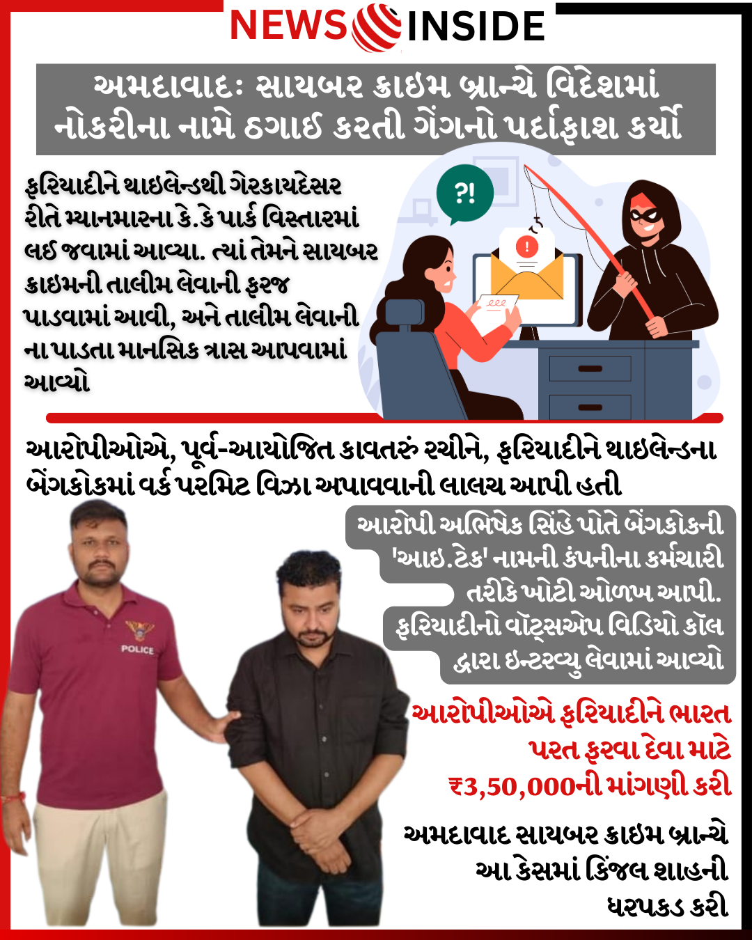 ​અમદાવાદ સાયબર ક્રાઇમ બ્રાંચે વિદેશમાં નોકરીના નામે થતા સાયબર ક્રાઇમનો પર્દાફાશ કરીને એક આરોપીની ધરપકડ કરી છે. આ કેસ 7 જૂન, 2025ના રોજ ઇન્ડિયન જસ્ટિસ કોડની વિવિધ કલમો અને આઇટી એક્ટની કલમ 66(ડી) હેઠળ દાખલ કરવામાં આવ્યો હતો. આ ગુનામાં ફરિયાદીએ થાઇલેન્ડના બેંગકોકમાં વર્ક પરમિટ વિઝા અપાવવાના બહાને થયેલી છેતરપિંડીની ફરિયાદ નોંધાવી હતી.