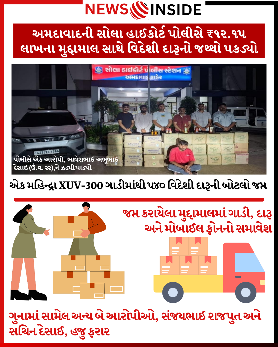 આ કામગીરીમાં પોલીસે દારૂ ઉપરાંત મહિન્દ્રા XUV-300 ગાડી (કિંમત ₹૮,૦૦,૦૦૦/-) અને એક મોબાઈલ ફોન (કિંમત ₹૭૦,૦૦૦/-) પણ જપ્ત કર્યો છે. આમ, કુલ ₹૧૨,૧૫,૩૬૦/-નો મુદ્દામાલ કબજે કરવામાં આવ્યો છે.