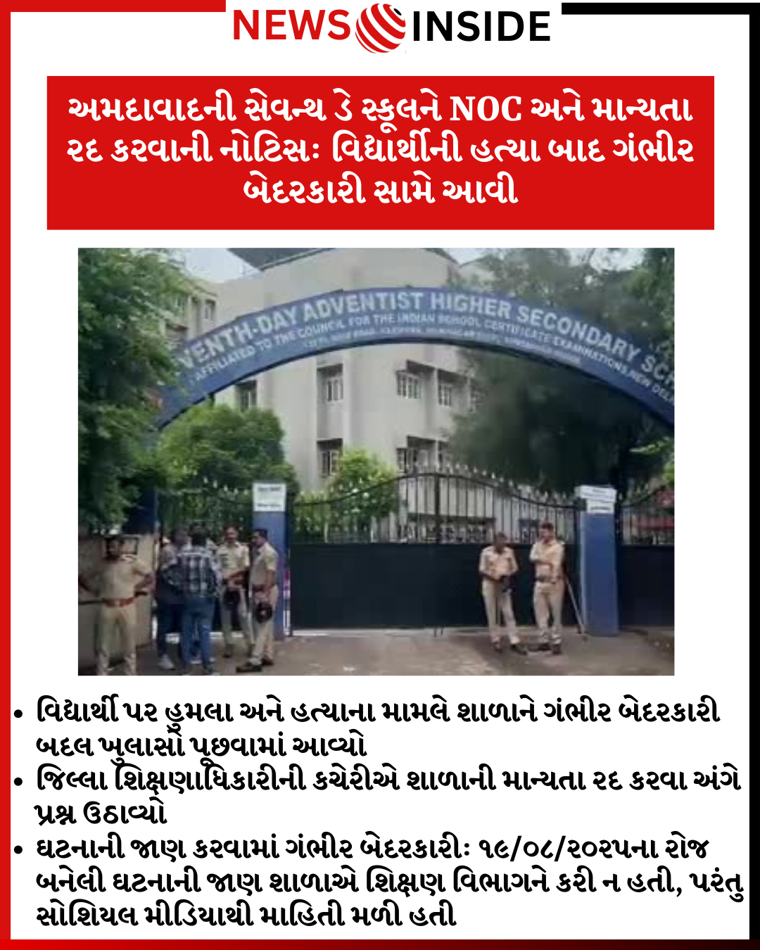 અમદાવાદ: અમદાવાદ શહેરના મણીનગર વિસ્તારમાં આવેલી સેવન્થ ડે એડવેન્ટીસ્ટ હાયર સેકન્ડરી સ્કૂલમાં બનેલી એક ગંભીર ઘટનાને પગલે જિલ્લા શિક્ષણાધિકારીની કચેરી દ્વારા શાળાના આચાર્ય/સંચાલકને નોટિસ પાઠવવામાં આવી છે. આ નોટિસમાં, શૈક્ષણિક વિભાગે શાળાની ગંભીર બેદરકારી અને ઉદાસીનતા પર સવાલ ઉઠાવ્યા છે અને પૂછ્યું છે કે શા માટે તેમની શાળાને આપવામાં આવેલ NOC અને માન્યતા રદ ન કરવી.