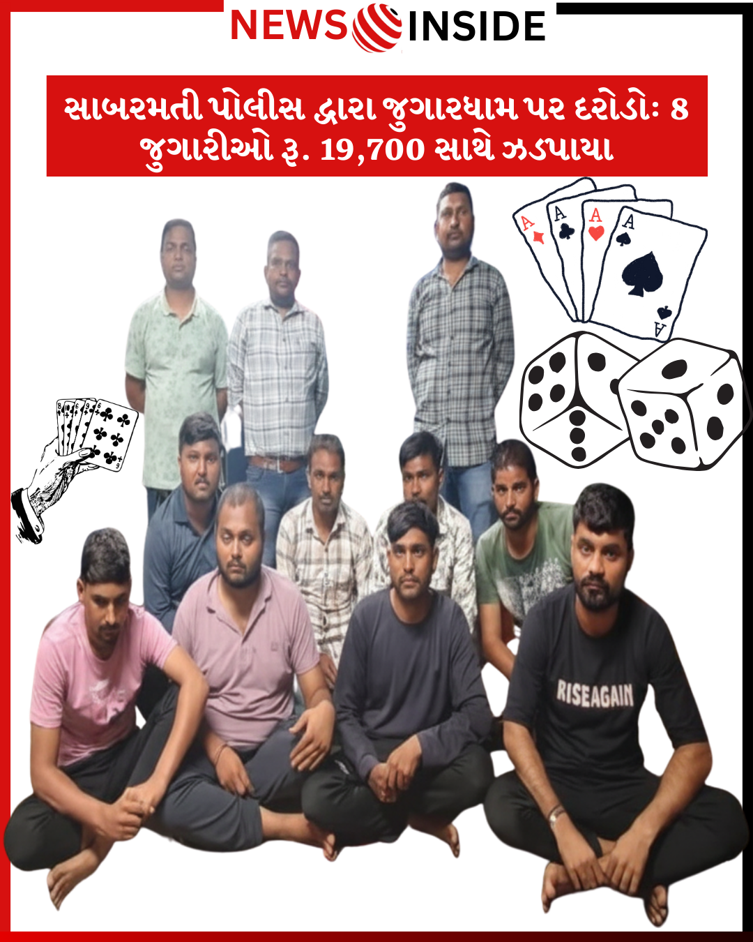અમદાવાદ: સાબરમતી પોલીસ સ્ટેશન વિસ્તારમાંથી પોલીસે જુગાર રમતા 8 લોકોને રૂ. 19,700ના મુદ્દામાલ સાથે ઝડપી પાડ્યા છે. આ કાર્યવાહી પોલીસ કમિશ્નરની પ્રોહી/જુગારની બદીને નેસ્તનાબૂદ કરવા માટે ચલાવવામાં આવેલી ડ્રાઈવના ભાગરૂપે કરવામાં આવી હતી.