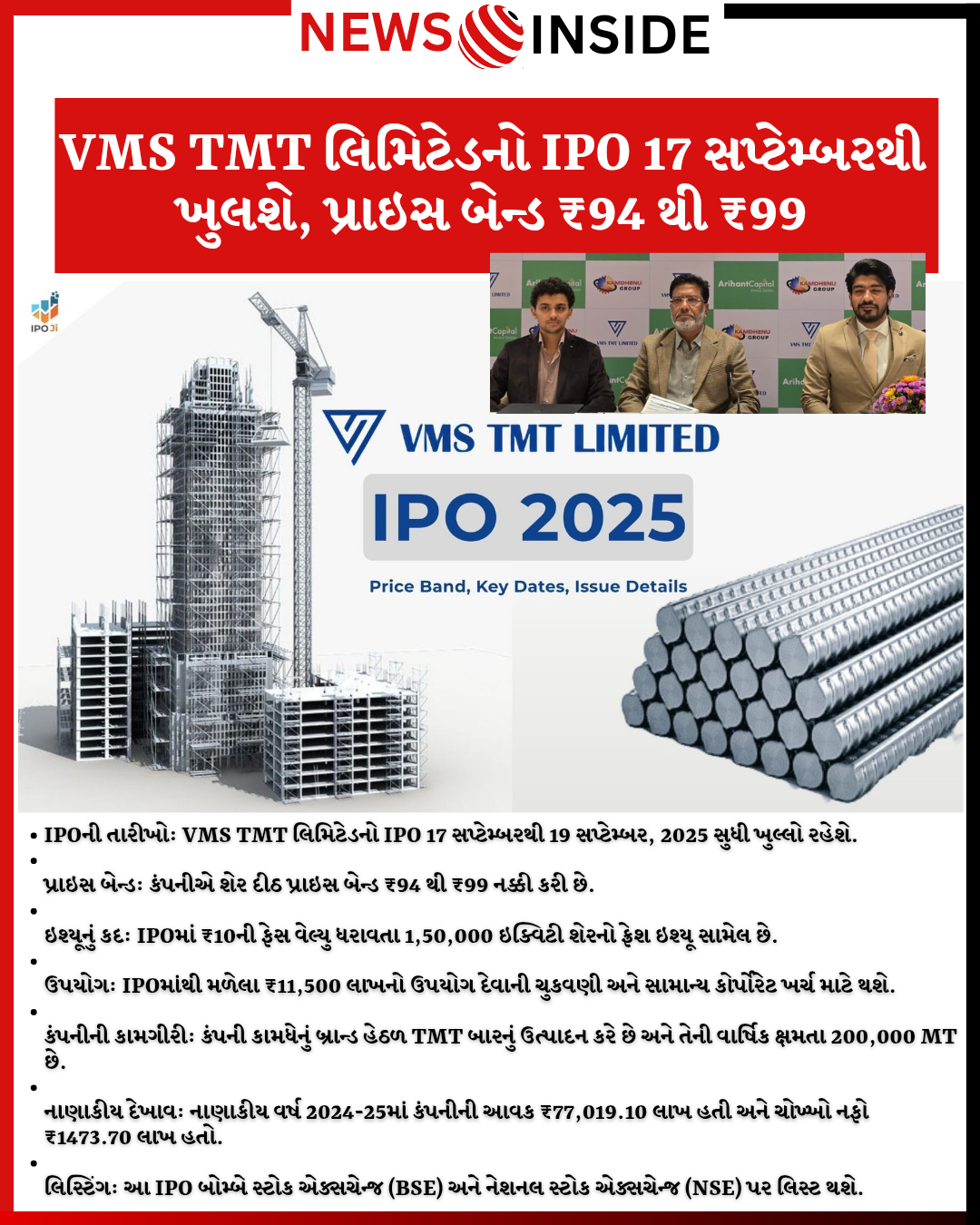 અમદાવાદ: ગુજરાતની અગ્રણી TMT બાર ઉત્પાદક કંપની VMS TMT લિમિટેડ પોતાનો ઇનિશિયલ પબ્લિક ઓફરિંગ (IPO) લાવી રહી છે. આ IPO સબસ્ક્રિપ્શન માટે 17 સપ્ટેમ્બર, 2025થી 19 સપ્ટેમ્બર, 2025 સુધી ખુલ્લો રહેશે. કંપનીએ પ્રતિ શેર ₹94 થી ₹99 ની પ્રાઇસ બેન્ડ નક્કી કરી છે.