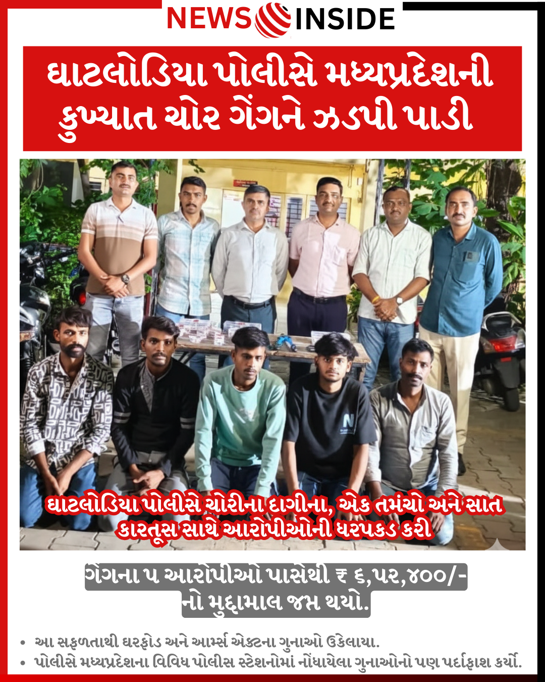 અમદાવાદ: ઘાટલોડિયા પોલીસે મોટી સફળતા મેળવી છે. મધ્યપ્રદેશની એક કુખ્યાત ચોર ગેંગના પાંચ આરોપીઓની ધરપકડ કરવામાં આવી છે. તેમની પાસેથી ચોરી કરેલા સોના-ચાંદીના દાગીના, એક તમંચો (પિસ્તોલ) અને સાત કારતૂસ મળી આવ્યા છે. આ તમામ મુદ્દામાલની કુલ કિંમત ₹ ૬,૫૨,૪૦૦/- છે.