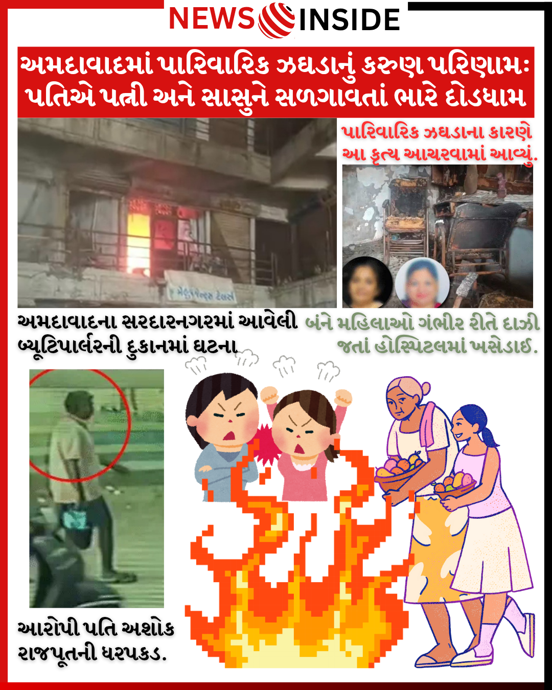 બનાવની વિગતો અનુસાર, કુબેરનગરમાં રહેતી એક પરિણીત મહિલા, જે બ્યૂટિપાર્લર ચલાવે છે, તેના અને તેના પતિ અશોક રાજપૂત વચ્ચે ઘણા મહિનાઓથી ઘરકંકાસ ચાલી રહ્યો હતો. મંગળવારે (23 સપ્ટેમ્બર) રાત્રે અશોક તેની પત્નીના બ્યૂટિપાર્લર પર આવ્યો અને ઝઘડો શરૂ કર્યો. આ સમયે, તેની સાસુ વચ્ચે પડતાં ઝઘડો વધુ ઉગ્ર બન્યો. ગુસ્સે થઈને અશોકે એક જ્વલનશીલ પદાર્થ પત્ની અને સાસુ પર છાંટીને આગ લગાવી અને તરત જ ઘટનાસ્થળેથી ભાગી ગયો.