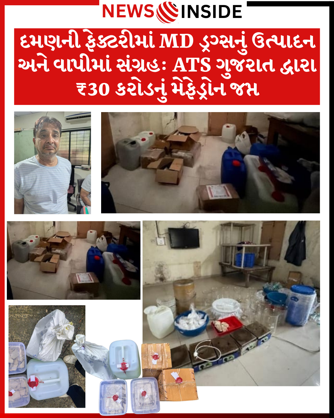 * દમણમાંથી જપ્ત: બામણપૂજાના ફાર્મહાઉસમાંથી મેફેડ્રોન બનાવવા માટે ઉપયોગમાં લેવાયેલ લગભગ 300 કિલો રો-મટીરીયલ અને ઉપકરણો જેમ કે ગ્રાઈન્ડર, મોટર, ગ્લાસ ફ્લાસ્ક, અને હીટર મળી આવ્યા હતા. અહીં ડ્રગ્સ બનાવવાની પ્રક્રિયા ચાલુ હતી.