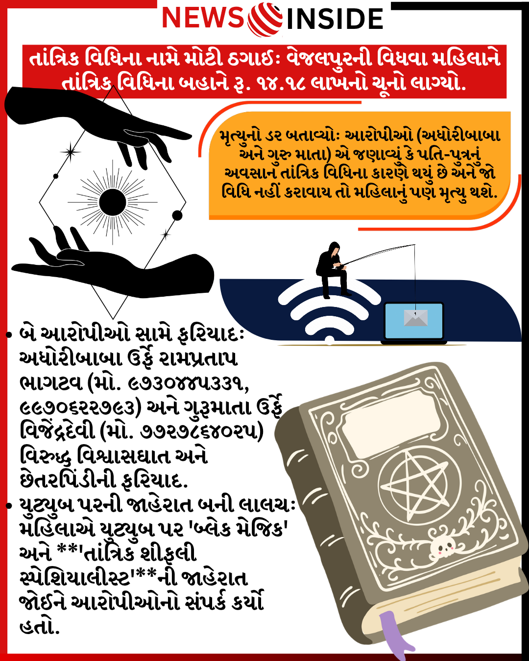 તાંત્રિક વિધિના નામે મોટી ઠગાઈ: વેજલપુરની વિધવા મહિલાને તાંત્રિક વિધિના બહાને રૂ. ૧૪.૧૮ લાખનો ચૂનો લાગ્યો.