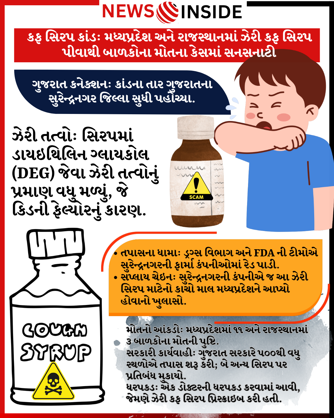 મધ્યપ્રદેશ અને રાજસ્થાનમાં ઝેરી કફ સિરપ પીવાથી બાળકોના મોતના કેસમાં ચોંકાવનારા ખુલાસાઓ થયા છે. આ ‘કફ સિરપ કાંડ’નું મુખ્ય નેટવર્ક હવે ગુજરાતના સુરેન્દ્રનગર જિલ્લા સુધી પહોંચ્યું છે, જ્યાંથી આ સિરપ માટેનો કાચો માલ સપ્લાય થયો હોવાનું બહાર આવ્યું છે.