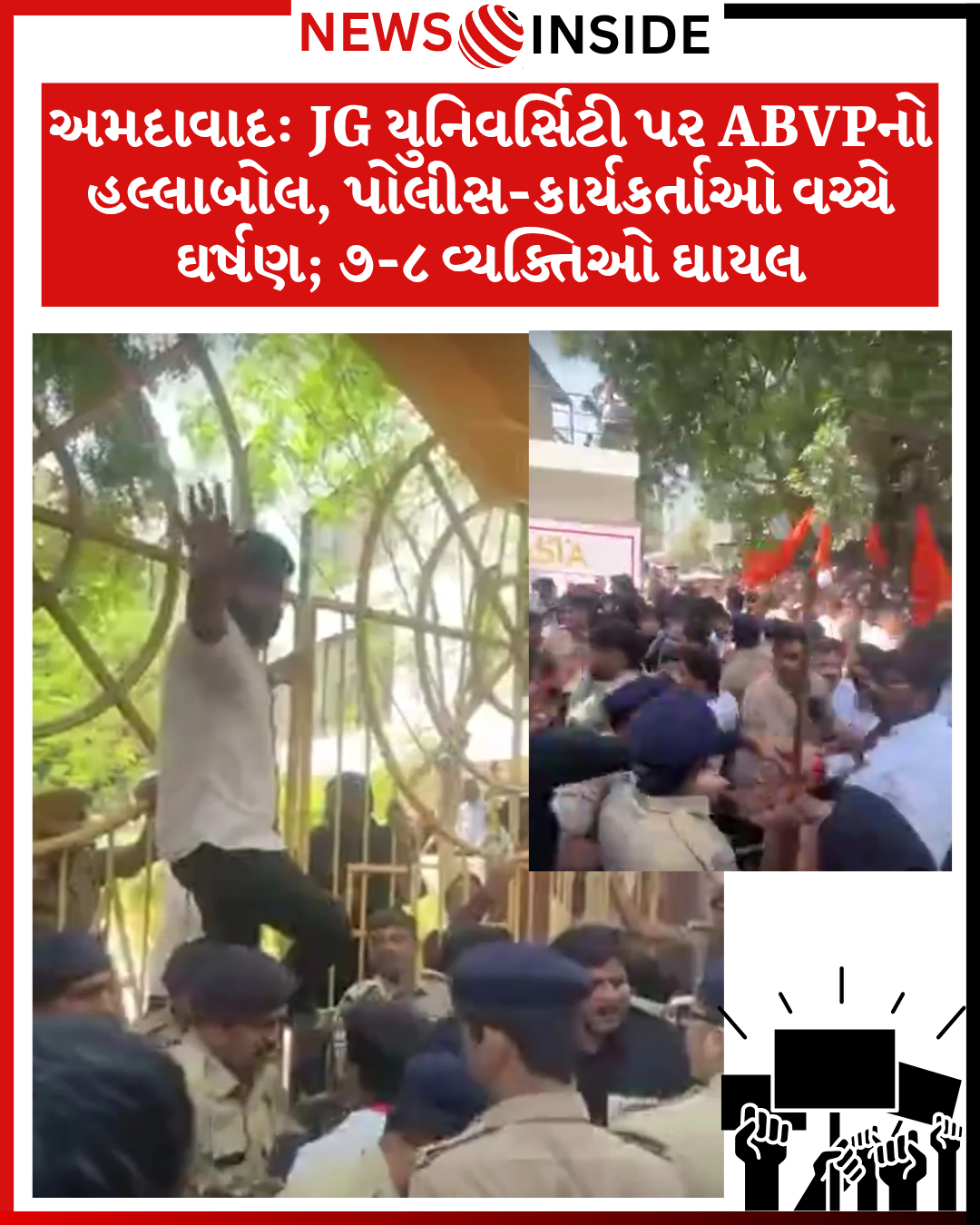 અમદાવાદ: JG યુનિવર્સિટી પર ABVPનો હલ્લાબોલ, પોલીસ-કાર્યકર્તાઓ વચ્ચે ઘર્ષણ; ૭-૮ વ્યક્તિઓ ઘાયલ