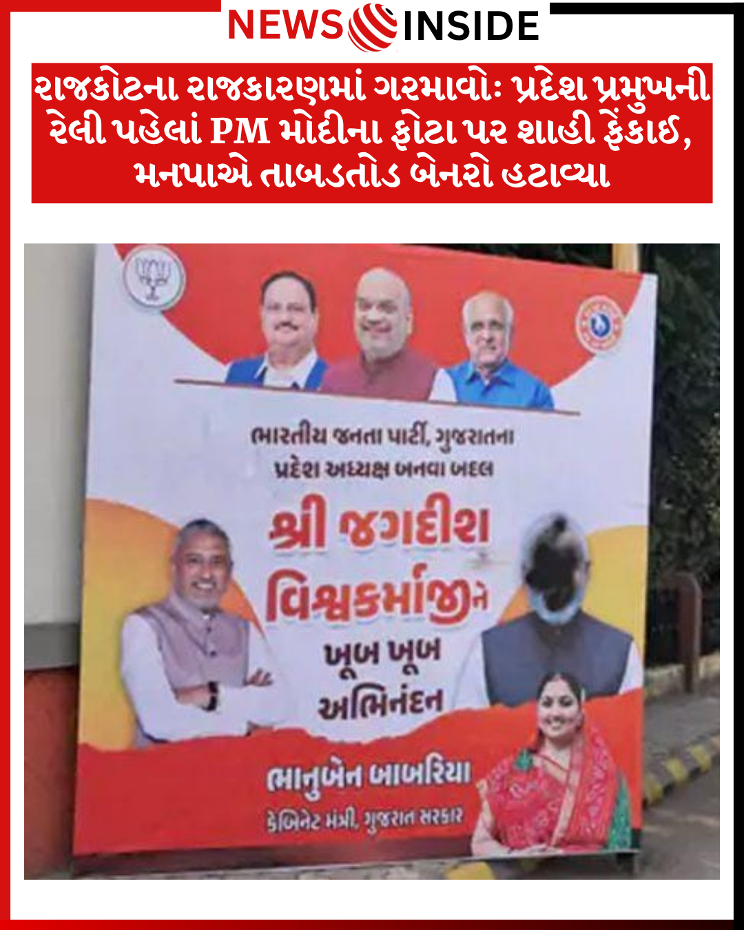 રાજકોટના રાજકારણમાં ગરમાવો: પ્રદેશ પ્રમુખની રેલી પહેલાં PM મોદીના ફોટા પર શાહી ફેંકાઈ, મનપાએ તાબડતોડ બેનરો હટાવ્યા