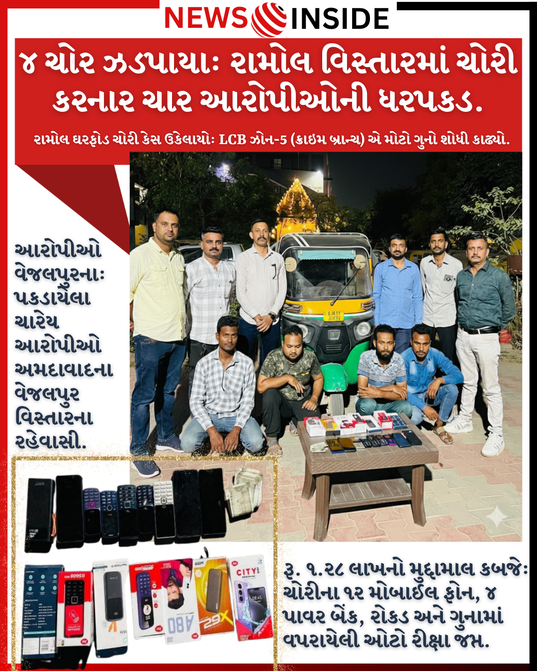 ​રૂ. ૧.૨૮ લાખનો મુદ્દામાલ કબજે: ચોરીના ૧૨ મોબાઈલ ફોન, ૪ પાવર બેંક, રોકડ અને ગુનામાં વપરાયેલી ઓટો રીક્ષા જપ્ત.