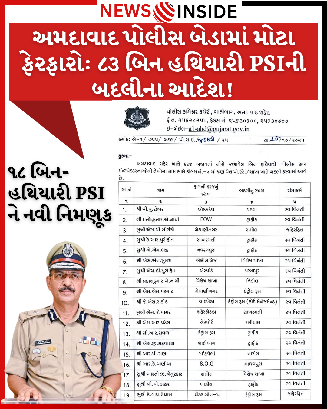 અમદાવાદ: ગુજરાત પોલીસ કમિશ્નર કચેરી, શાહીબાગ, અમદાવાદ શહેર દ્વારા તારીખ ૨૭/૧૦/૨૦૨૫ના રોજ એક મહત્ત્વપૂર્ણ આદેશ જારી કરવામાં આવ્યો છે, જેમાં અમદાવાદ શહેરમાં ફરજ બજાવતાં કુલ ૮૩ બિન હથિયારી પોલીસ સબ-ઇન્સ્પેક્ટર (PSI)ની બદલી કરવામાં આવી છે. પોલીસ કમિશ્નર શ્રી જી.એસ.મલિકની સહીથી જારી કરાયેલા આ હુકમમાં, ઘણા અધિકારીઓને જાહેર હિતમાં, જ્યારે અમુકની સ્વ-વિનંતીના આધારે બદલીઓ કરવામાં આવી છે.