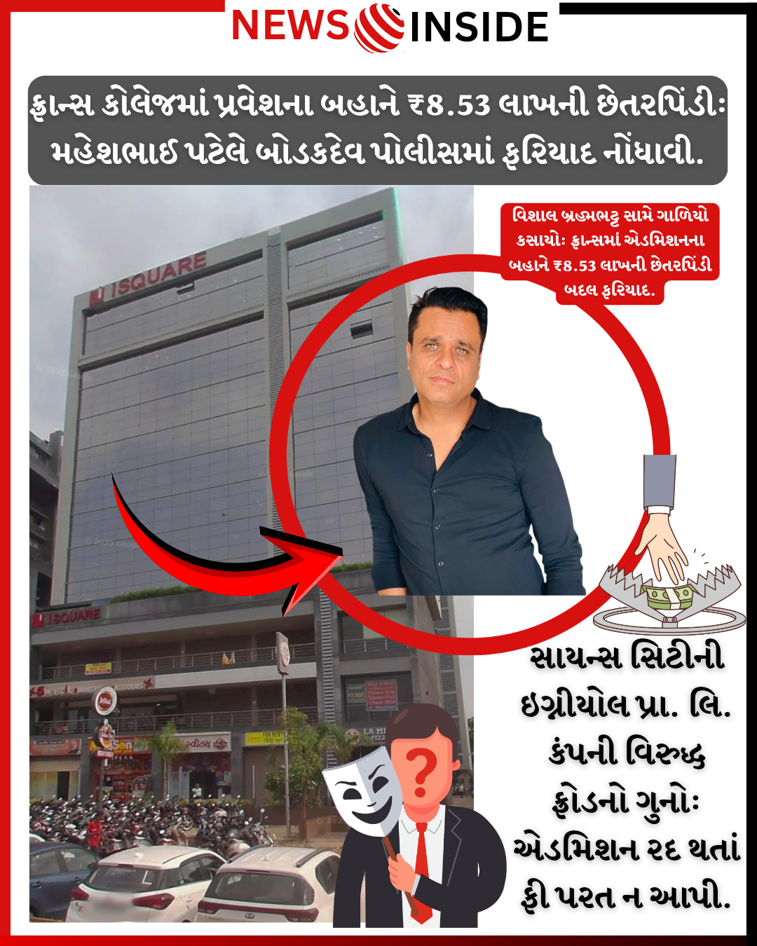ફ્રાન્સ કોલેજમાં પ્રવેશના બહાને ₹8.53 લાખની છેતરપિંડી: મહેશભાઈ પટેલે બોડકદેવ પોલીસમાં ફરિયાદ નોંધાવી.