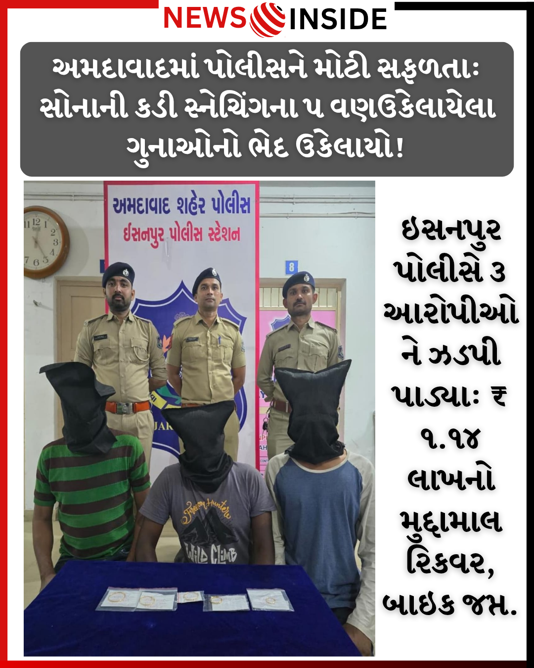 અમદાવાદ: તારીખ ૨૨/૧૧/૨૦૨૫ ના રોજ, ઇસનપુર પોલીસ સ્ટેશનને એક મોટી સફળતા મળી છે. ઇસનપુર, નારોલ, મણીનગર અને વટવા પોલીસ સ્ટેશન વિસ્તારમાં બનેલા કાનમાં પહેરવાની સોનાની કડી સ્નેચિંગના ૫ વણઉકેલાયેલા (અનડિટેકટ) ગુનાઓનો ભેદ ઉકેલીને ત્રણ આરોપીઓને પકડી પાડવામાં આવ્યા છે.