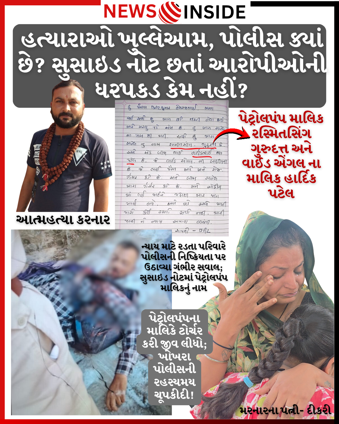 શહેરના ખોખરા વિસ્તારમાં પેટ્રોલપંપ કર્મચારી કિરીટકુમાર હેમરાજભાઈ પંચાલ (ઉં.વ. ૩૬)ના આત્મહત્યા કેસે આજે ન્યાયિક અને પોલીસ પ્રક્રિયા પર ગંભીર સવાલો ઊભા કર્યા છે. મણીનગર રેલવે સ્ટેશન નજીક ટ્રેન નીચે પડતું મૂકીને કિરીટભાઈએ જીવન ટૂંકાવ્યું હતું, પરંતુ તેમના મૃત્યુ પાછળનું કારણ તેમની સુસાઇડ નોટમાં સ્પષ્ટ લખેલું છે: પેટ્રોલપંપ માલિક રસ્મિતસિંગ ગુરુદત્ત અને વાઈડ એંગલ ના માલિક હાર્દિક પટેલ દ્વારા રૂપિયા માટે અપાતો અસહ્ય આર્થિક અને માનસિક ત્રાસ.