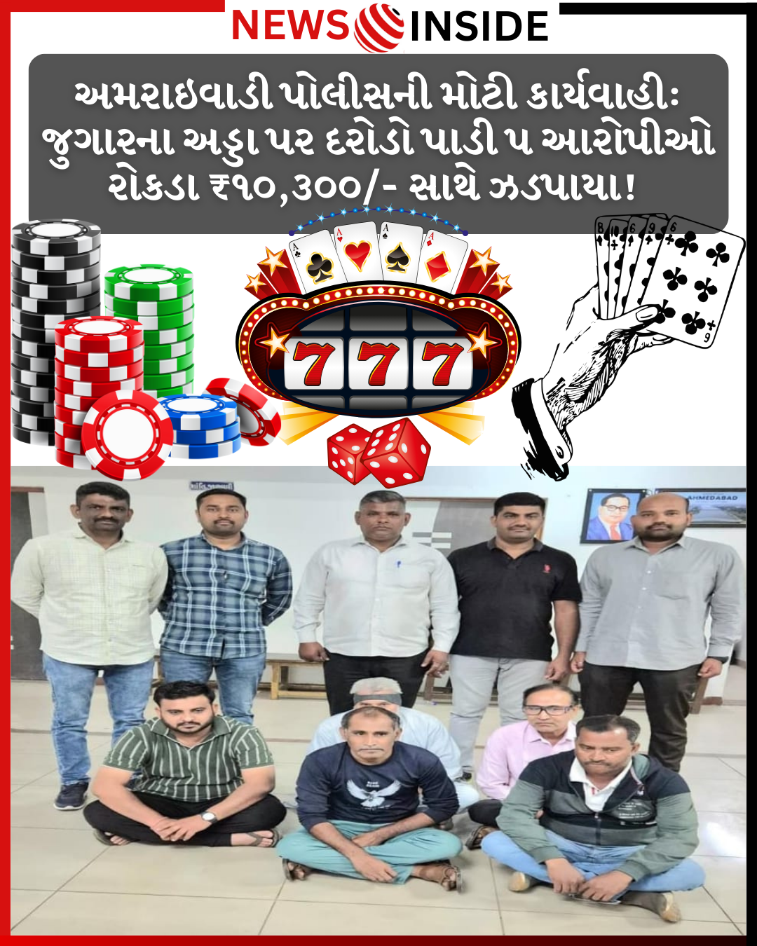 અમદાવાદ: અમદાવાદ શહેરના અમરાઇવાડી વિસ્તારમાં ગેરકાયદેસર જુગારની પ્રવૃત્તિઓ પર લગામ કસવા માટે પોલીસ કમિશનરશ્રી તરફથી મળેલી સૂચના બાદ, અમરાઇવાડી પોલીસે એક મહત્વપૂર્ણ કેસ શોધી કાઢ્યો છે. પોલીસે જુગાર રમતા પાંચ (૦૫) આરોપીઓને ઝડપી પાડ્યા છે.