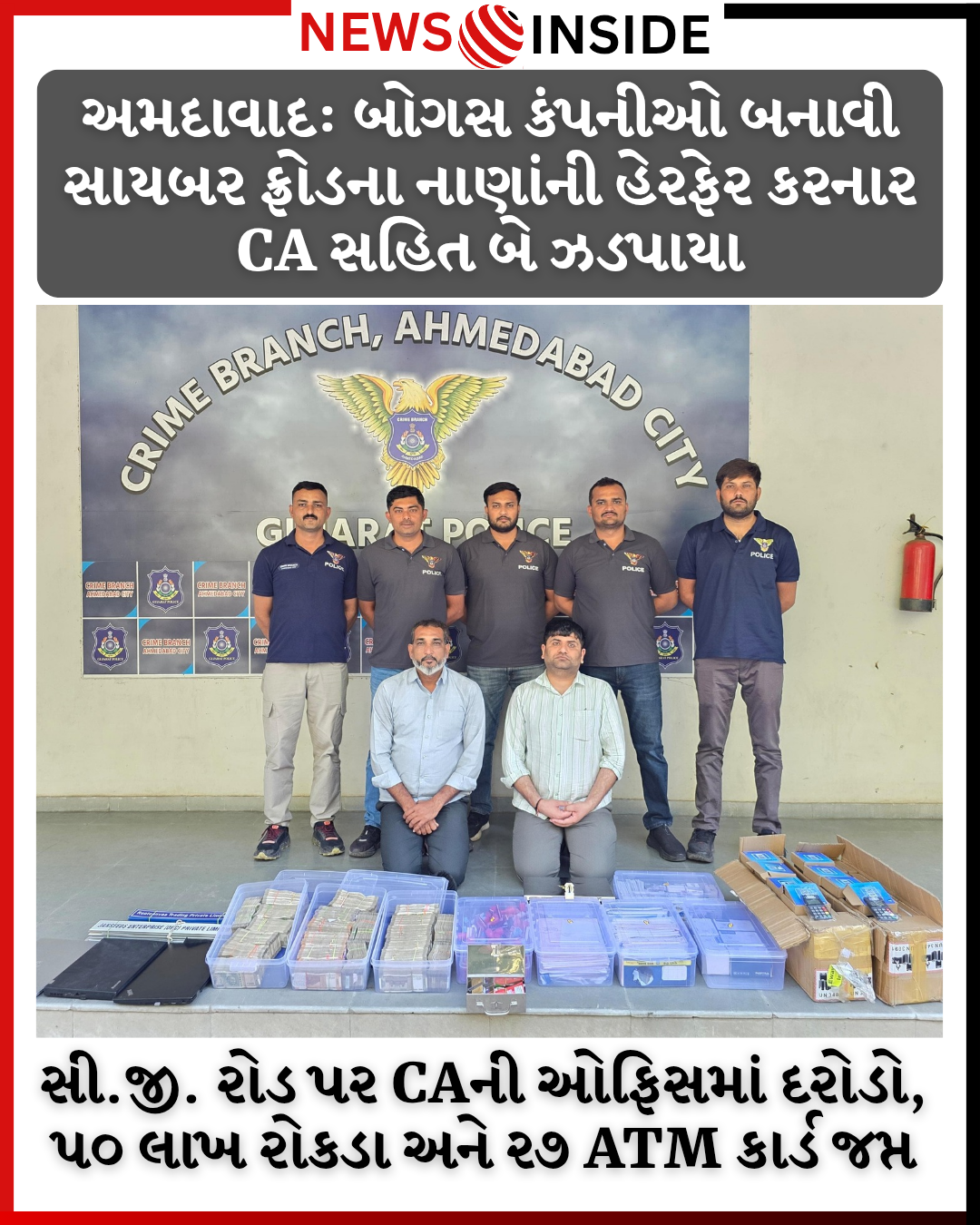 અમદાવાદ ક્રાઈમ બ્રાન્ચે સી.જી. રોડ પર આવેલી એક ચાર્ટર્ડ એકાઉન્ટન્ટ (CA)ની ઓફિસ પર દરોડો પાડીને સાયબર ફ્રોડના નાણાંની હેરફેર કરતા મોટા કૌભાંડનો પર્દાફાશ કર્યો છે.