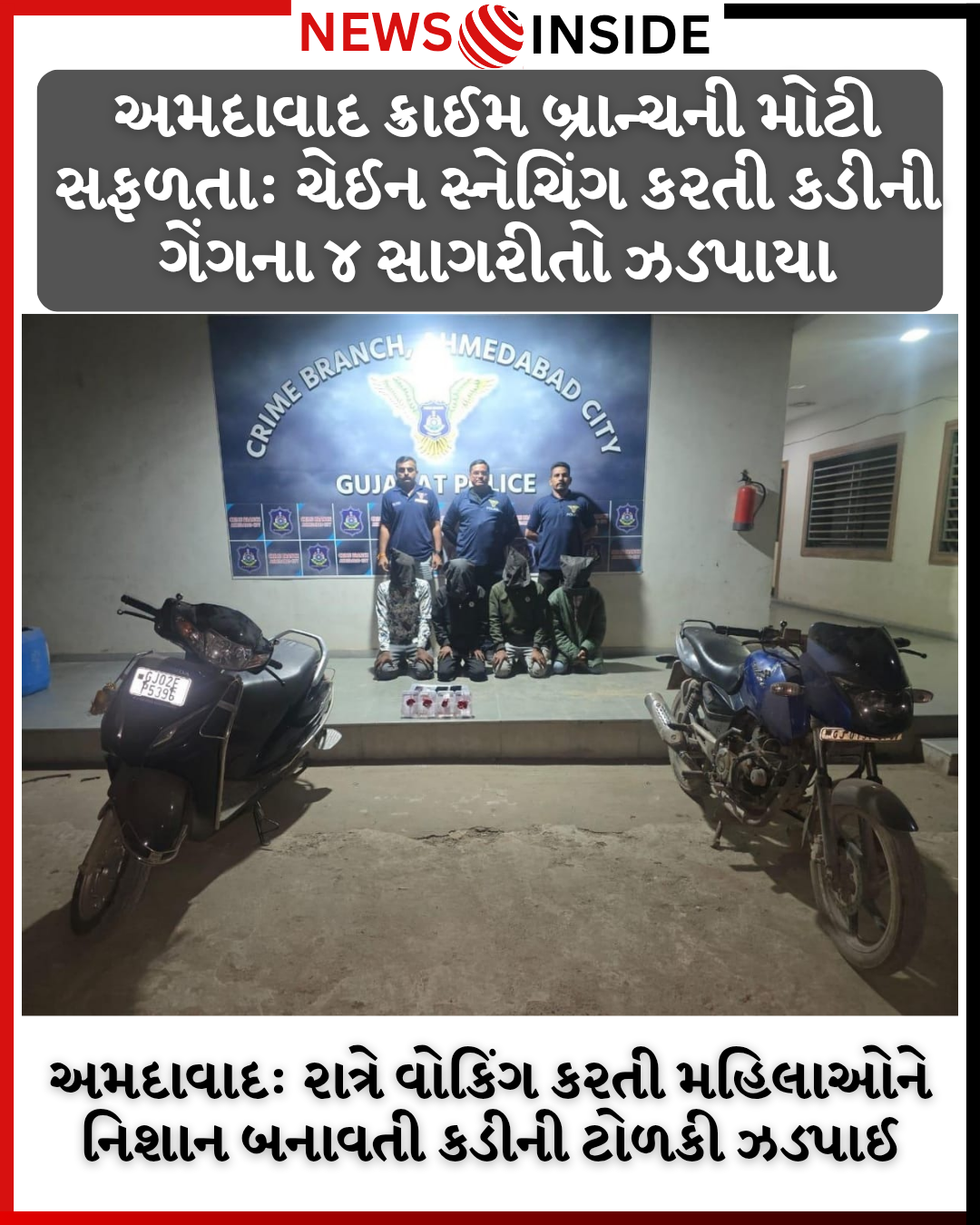 અમદાવાદ ક્રાઈમ બ્રાન્ચની મોટી સફળતા: ચેઈન સ્નેચિંગ કરતી કડીની ગેંગના ૪ સાગરીતો ઝડપાયા