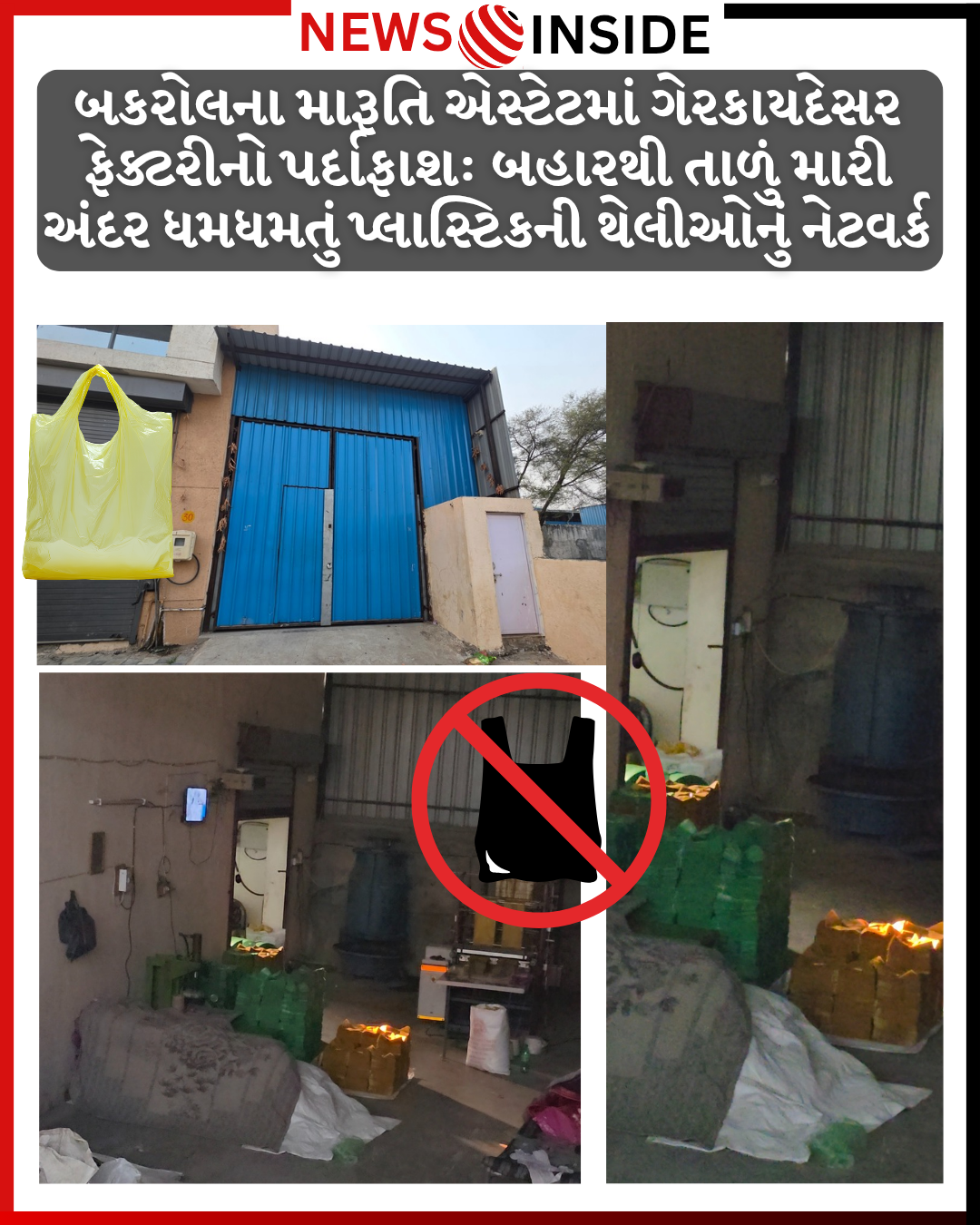 ઔદ્યોગિક વિસ્તારમાં ગેરકાયદેસર પ્રવૃત્તિઓનો સિલસિલો યથાવત હોય તેમ લાગી રહ્યું છે. બાકરોલ ખાતે આવેલા મારૂતિ એસ્ટેટના શેડ નંબર 30 માં એક ચોંકાવનારી વિગત સામે આવી છે. અહીં સરકારી નિયમોના ધજાગરા ઉડાવીને ગેરકાયદેસર રીતે પાણી અને પ્લાસ્ટિકની થેલીઓ બનાવવાની ફેક્ટરી ધમધમી રહી હોવાની માહિતી મળી છે.