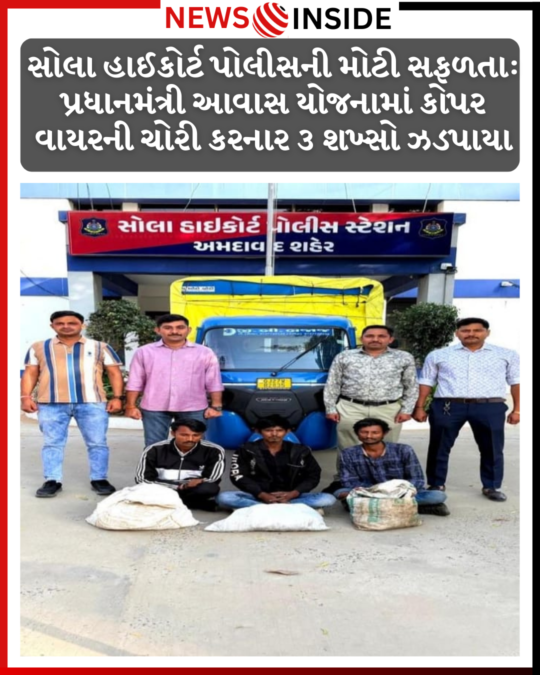 અમદાવાદ: શહેરમાં ઘરફોડ ચોરી અને મિલકત વિરુદ્ધના ગુનાઓ ડામવા માટે પોલીસ કમિશનર દ્વારા અપાયેલી સૂચનાના પગલે સોલા હાઈકોર્ટ પોલીસે પ્રશંસનીય કામગીરી કરી છે. ગોતા વિસ્તારમાં નવી બનતી પ્રધાનમંત્રી આવાસ યોજનાની સાઇટ પરથી લાખો રૂપિયાના કોપર વાયરની ચોરી કરનાર ત્રણ આરોપીઓને પોલીસે મુદ્દામાલ સાથે દબોચી લીધા છે.