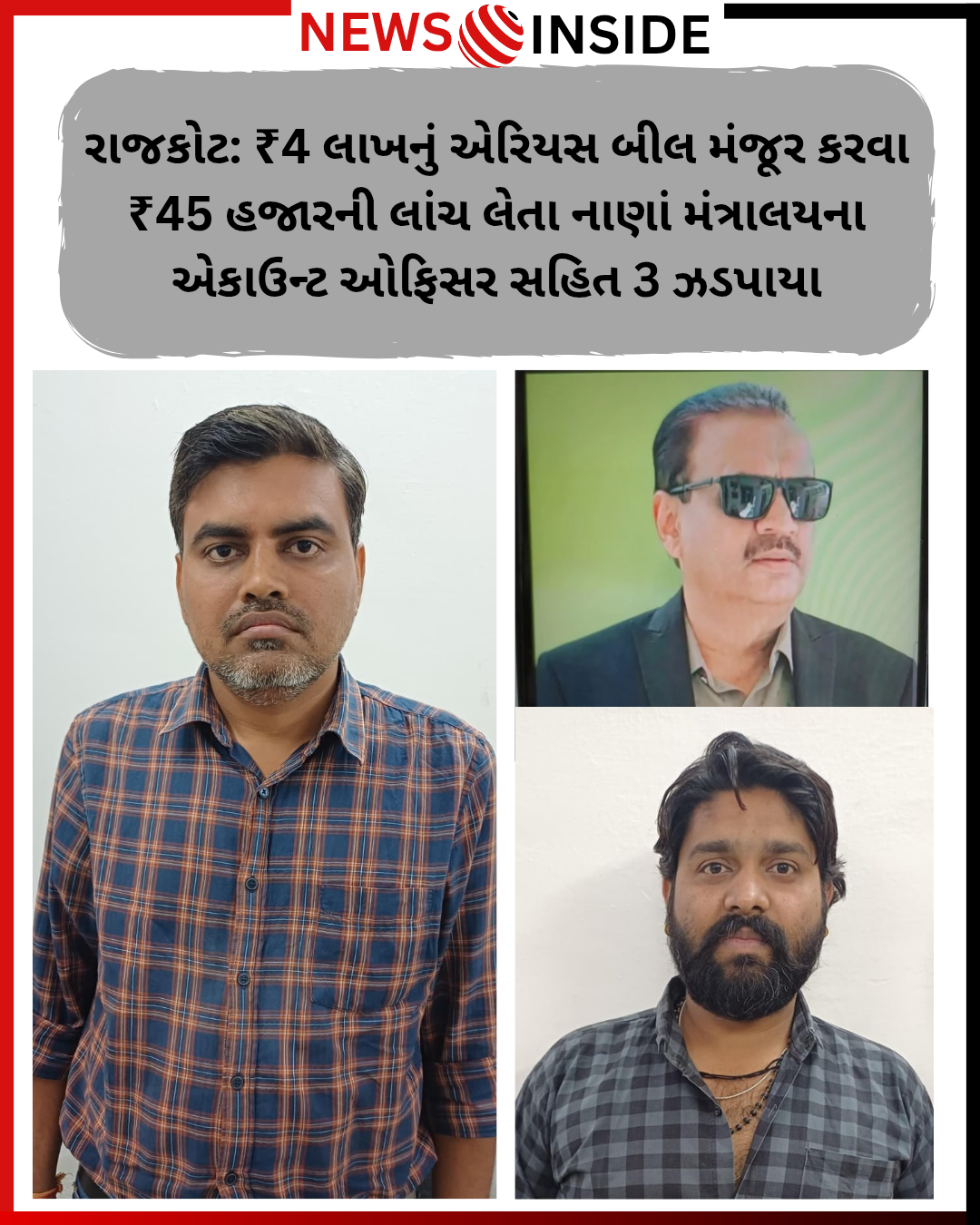 રાજકોટ: ભ્રષ્ટાચાર સામે લાલ આંખ કરતા એ.સી.બી. (ACB) દ્વારા રાજકોટમાં એક મોટી કાર્યવાહી કરવામાં આવી છે. મિનિસ્ટ્રી ઓફ ફાયનાન્સના આસીસ્ટન્ટ એકાઉન્ટ ઓફિસર, એક નિવૃત્ત ઇન્કમટેક્ષ ઇન્સપેક્ટર અને એક પટાવાળાને ₹45,000ની લાંચ લેતા રંગેહાથ ઝડપી લેવામાં આવ્યા છે. ₹4 લાખનું એરિયસ બીલ પાસ કરવા માટે બીલના 20% લેખે લાંચની માંગણી કરવામાં આવી હતી.