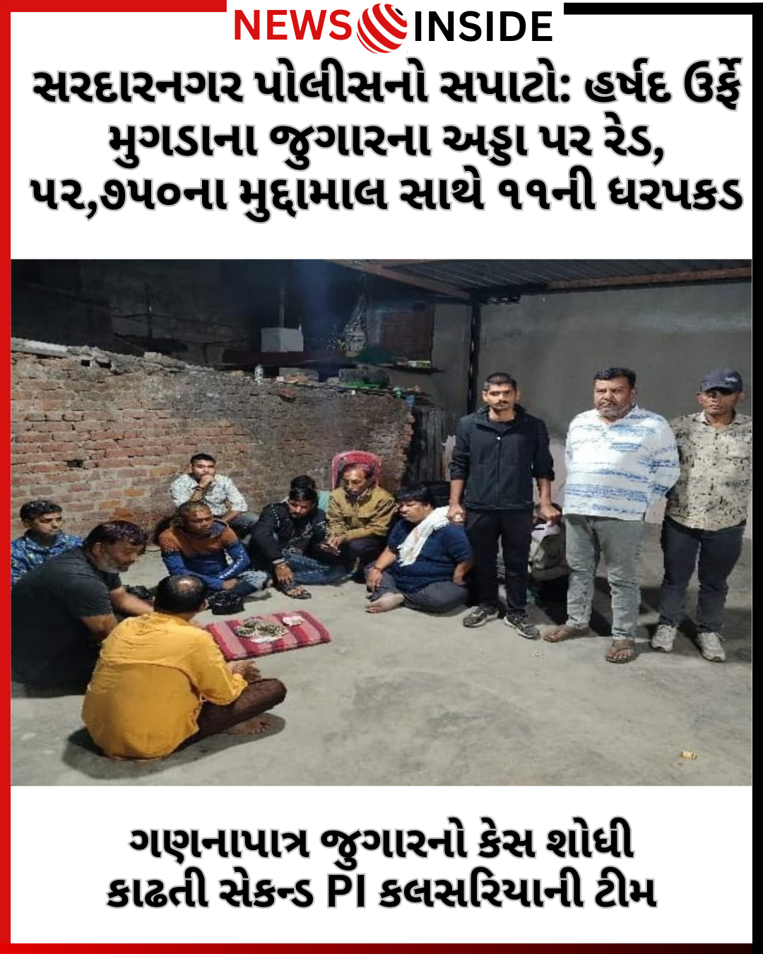 અમદાવાદ શહેરના સરદારનગર પોલીસ સ્ટેશન વિસ્તારમાં પ્રોહિબિશન અને જુગારની પ્રવૃત્તિઓને નેસ્તનાબૂદ કરવા માટે ઉચ્ચ પોલીસ અધિકારીઓની સૂચના અને માર્ગદર્શન હેઠળ સેકન્ડ પોલીસ ઇન્સ્પેક્ટર એન.બી. કલસરિયા અને તેમની ટીમે મોટી સફળતા મેળવી છે. કુબેરનગરના ચાચર ચોક વિસ્તારમાં ચાલતા એક ગણનાપાત્ર જુગારના કેસને શોધી કાઢવામાં આવ્યો છે.