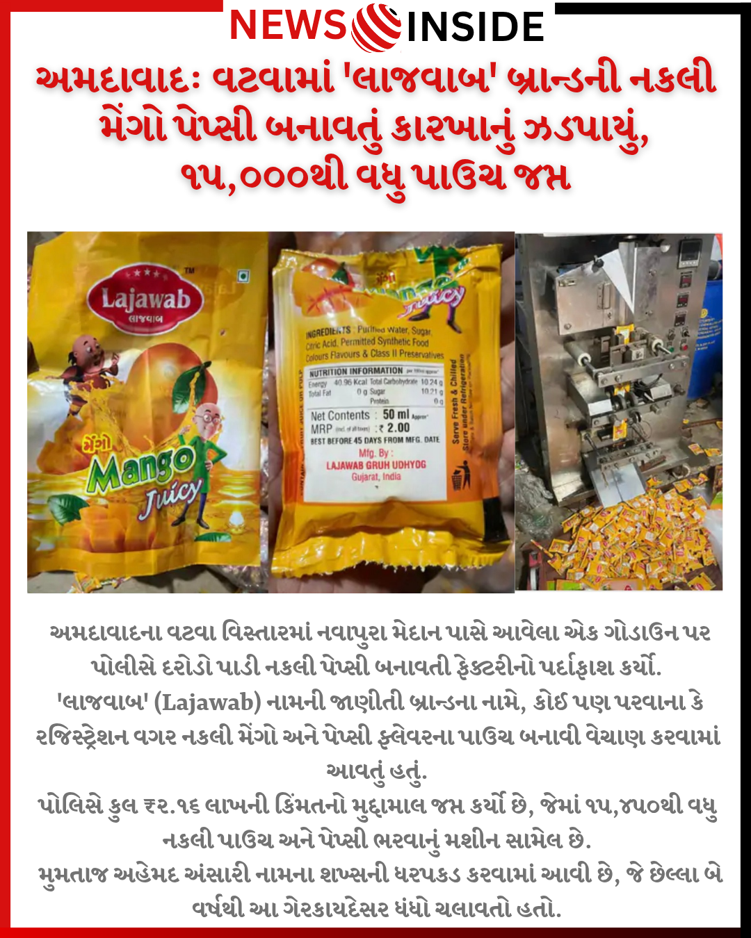 અમદાવાદ: વટવામાં ‘લાજવાબ’ બ્રાન્ડની નકલી મેંગો પેપ્સી બનાવતું કારખાનું ઝડપાયું, ૧૫,૦૦૦થી વધુ પાઉચ જપ્ત