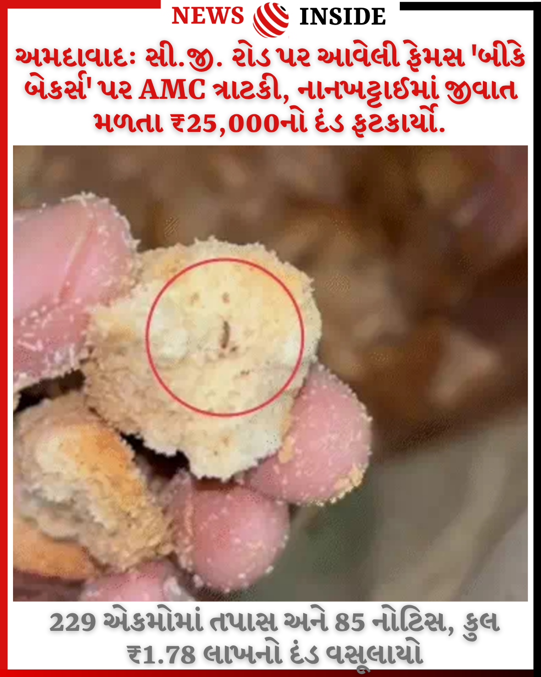 એક જાગૃત ગ્રાહકે બીકે બેકર્સમાંથી નાનખટ્ટાઈ (બિસ્કિટ) ખરીદ્યા હતા, જેમાં તપાસ કરતા અંદરથી જીવતા જીવજંતુઓ મળી આવ્યા હતા. ગ્રાહકની ફરિયાદને આધારે AMCના આરોગ્ય વિભાગની ટીમ તાત્કાલિક સ્થળ પર પહોંચી હતી. તપાસ દરમિયાન બેકરીના એકમમાં સફાઈનો અભાવ અને હાઈજીન સંબંધી અનેક ક્ષતિઓ જોવા મળી હતી. જેના પગલે કોર્પોરેશને બેકરીને ₹25,000નો દંડ ફટકાર્યો છે.