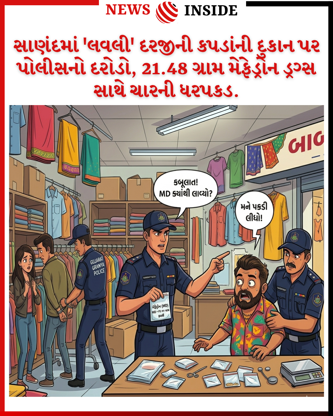 મળતી માહિતી મુજબ, સાણંદ પોલીસ સ્ટેશનના કોન્સ્ટેબલ મહિપાલસિંહ સુરેન્દ્રસિંહને ખાનગી રાહે બાતમી મળી હતી કે, સાણંદના નાળાની ભાગોળ પાસે આવેલી ‘બાબા ફેશન’ નામની કપડાંની દુકાનનો માલિક ધવલ ઉર્ફે લવલી મનુભાઈ દરજી કપડાં વેચવાની આડમાં MD ડ્રગ્સનું છૂટક વેચાણ કરે છે. આ બાતમીના આધારે પોલીસે તુરંત જ દુકાન પર રેઇડ કરી હતી.