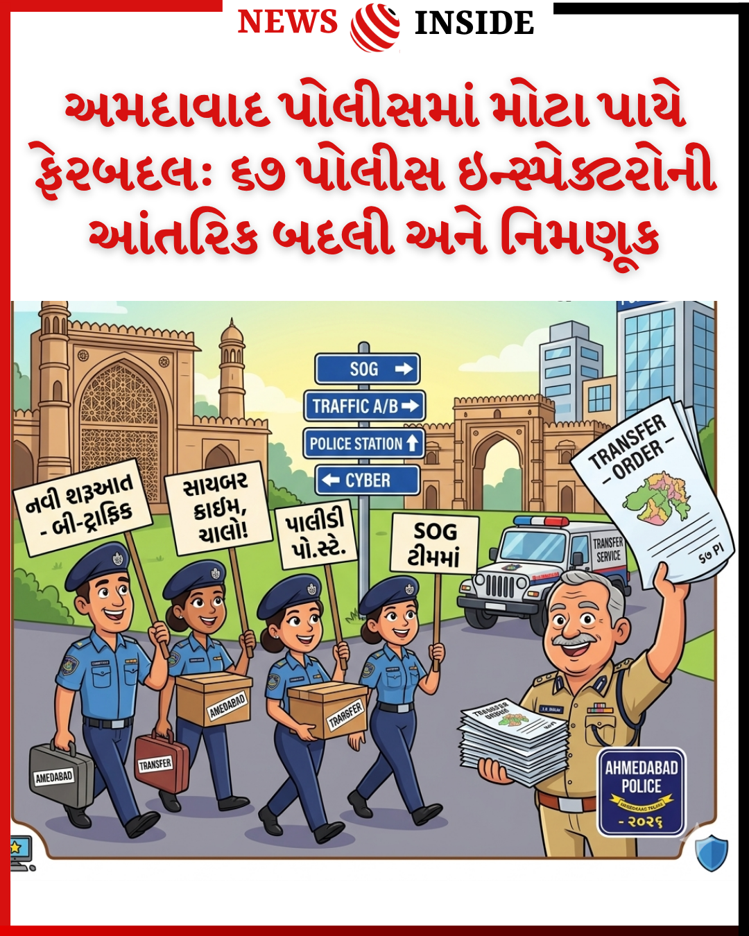 અમદાવાદ શહેર પોલીસ કમિશનર જી.એસ. મલિક દ્વારા એક સાથે ૬૭ પોલીસ ઇન્સ્પેક્ટરો (PI) ની નિમણૂક અને આંતરિક બદલીના આદેશ જારી કરવામાં આવ્યા છે. આ ફેરબદલમાં અન્ય જિલ્લાઓમાંથી આવેલા ૫૪ અધિકારીઓને નિમણૂક અપાઈ છે, જ્યારે ૧૩ અધિકારીઓની શહેરમાં જ આંતરિક અદલા-બદલી કરવામાં આવી છે.