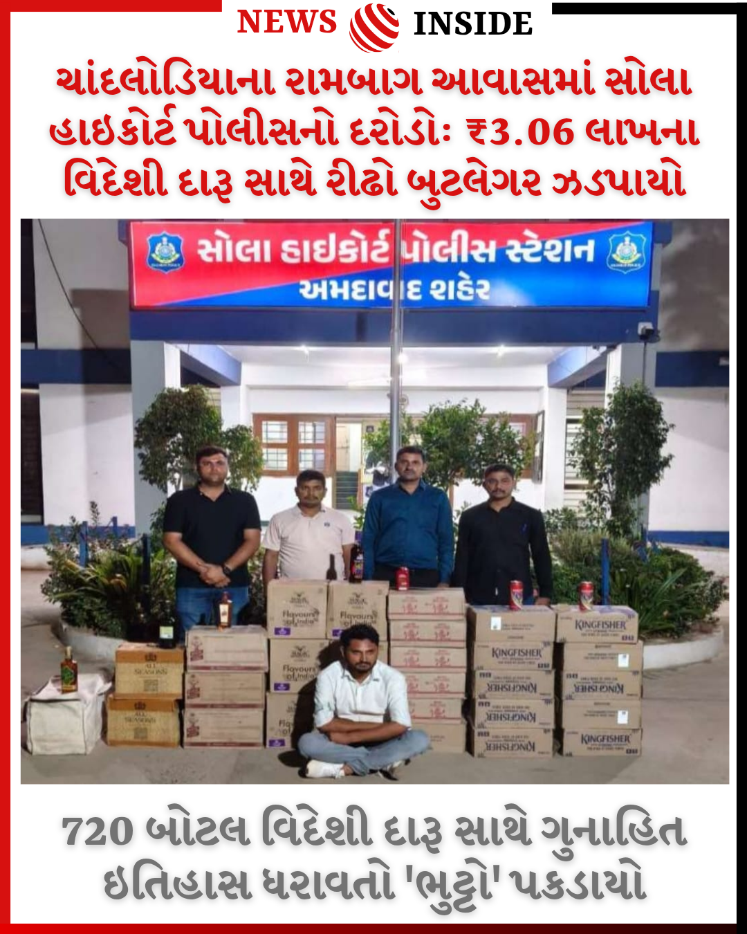 સોલા હાઈકોર્ટ પોલીસના જણાવ્યા અનુસાર, ચોક્કસ બાતમીના આધારે ચાંદલોડિયા રામબાગ આવાસના મકાન નંબર ૧૬/૫૦૦ માં દરોડો પાડવામાં આવ્યો હતો. ત્યાંથી પોલીસને અલગ-અલગ બ્રાન્ડની વિદેશી દારૂની કુલ ૭૨૦ બોટલો મળી આવી છે, જેની બજાર કિંમત આશરે ₹૩,૦૬,૪૮૦/- અંકાય છે. પોલીસે આ કેસમાં અલ્પેશ ઉર્ફે ભુટ્ટો નામના શખ્સની ધરપકડ કરી છે.