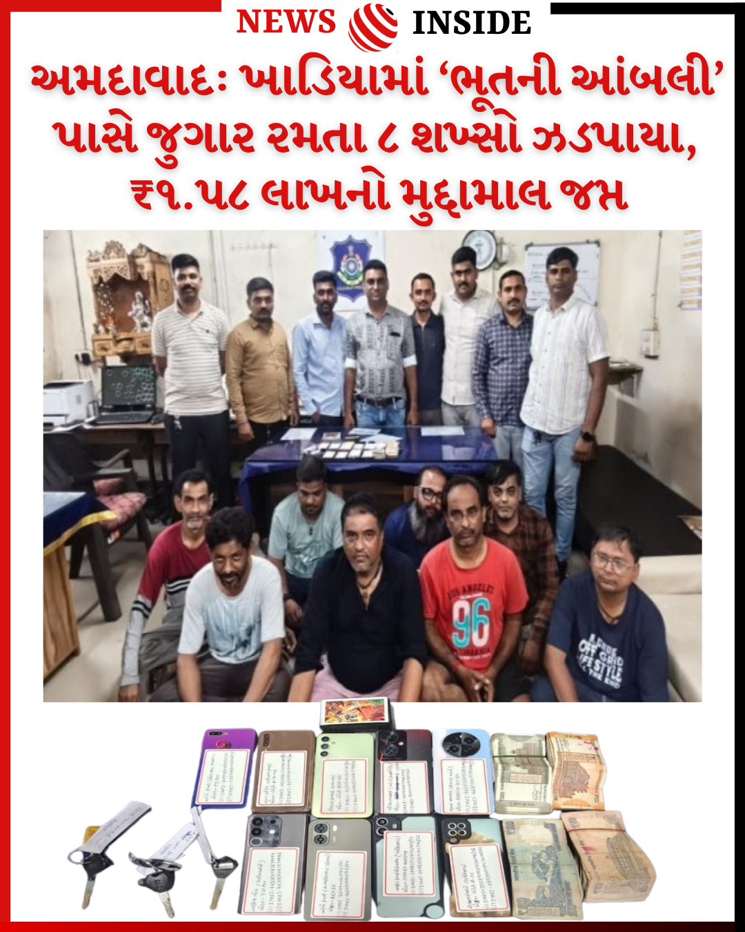 અમદાવાદ: સ્થાનિક સ્વરાજ્યની આગામી સામાન્ય ચૂંટણી-૨૦૨૬ના પગલે શહેરભરમાં દારૂ અને જુગાર જેવી અસામાજિક પ્રવૃત્તિઓને નેસ્તનાબૂદ કરવાની સૂચનાના અમલીકરણમાં ખાડિયા પોલીસને મોટી સફળતા મળી છે. ખાડિયા સર્વેલન્સ સ્કોડે પેટ્રોલિંગ દરમિયાન બાતમીના આધારે રાયપુર વિસ્તારમાં આવેલી કોઠની પોળમાં રેડ પાડી હાર-જીતનો જુગાર રમતા ૮ ઇસમોને કુલ ₹૧.૫૮ લાખના મુદ્દામાલ સાથે ઝડપી પાડ્યા છે.