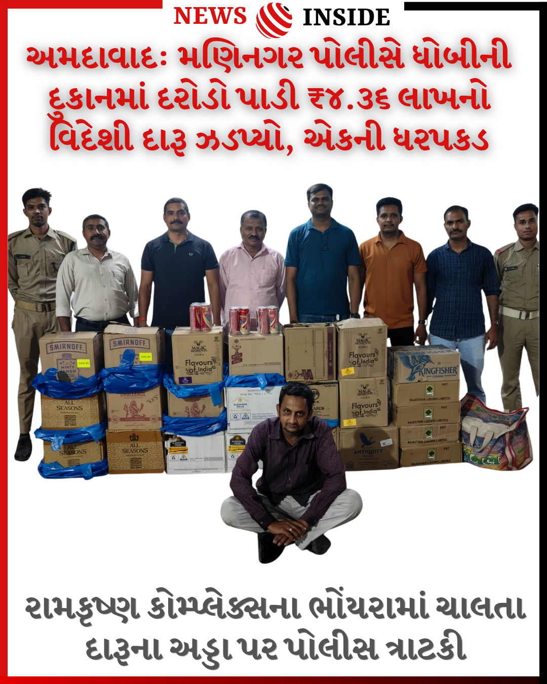 મણિનગર સર્વેલન્સ સ્ક્વોડના પોલીસ સબ ઇન્સ્પેક્ટર એસ.આઈ. પટેલ અને તેમની ટીમ પેટ્રોલિંગમાં હતી, તે દરમિયાન પોલીસ કોન્સ્ટેબલ લલીતભાઈ અને પરિમલભાઈને ચોક્કસ બાતમી મળી હતી કે, ઝધડિયા બ્રિજ પાસે આવેલા રામકૃષ્ણ કોમ્પ્લેક્ષના ભોંયરામાં દુકાન નંબર-૩ માં હરીશ નાનાલાલ બોડાણા નામનો શખ્સ પોતાની ધોબીની દુકાનમાં દારૂનો જથ્થો રાખી વેચાણ કરી રહ્યો છે.