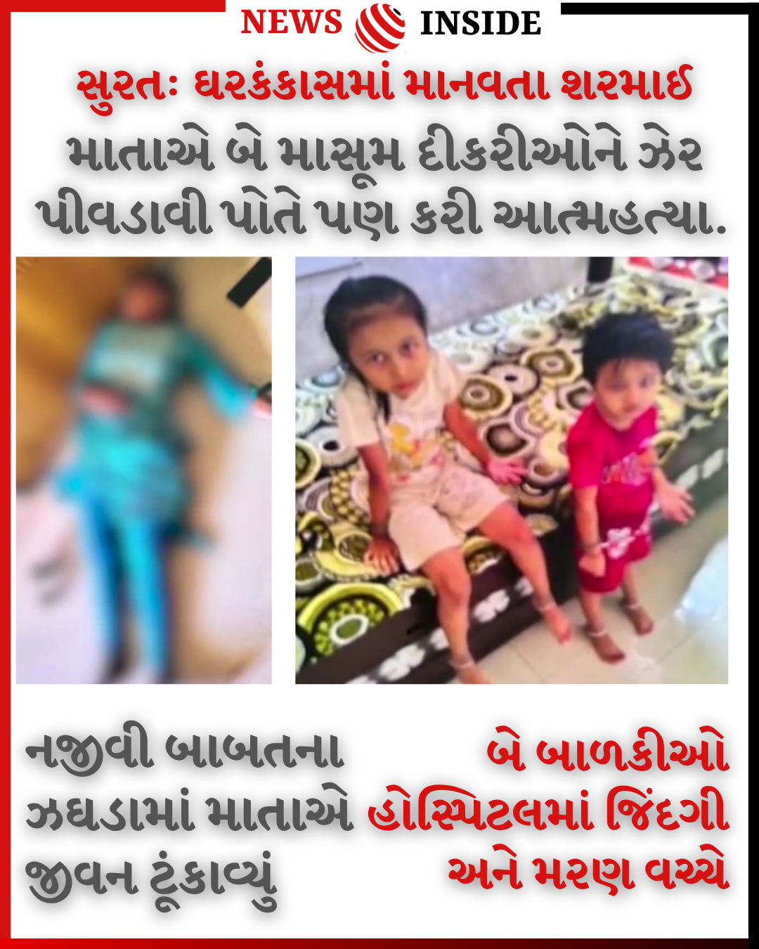 મળતી વિગતો અનુસાર, ડભોલી વિસ્તારમાં રહેતા અને હીરાના કારખાનામાં કામ કરતા મનસુખભાઈ (નામ બદલેલ છે) બુધવારે બપોરે ઘરે જમવા આવ્યા હતા. પરિવાર સાથે ખુશી-ખુશી જમ્યા બાદ તેઓ પરત કામે ગયા હતા. જોકે, તેમના ગયા બાદ પત્ની કીર્તિબેને (નામ બદલેલ છે) એકાએક અત્યંત આઘાતજનક પગલું ભર્યું હતું. તેમણે ઘરમાં રહેલી અનાજમાં નાખવાની ઝેરી દવા પાણીમાં ભેળવી પોતાની 6 અને 5 વર્ષની બે પુત્રીઓને પીવડાવી દીધી હતી અને ત્યારબાદ પોતે પણ તે ગટગટાવી લીધી હતી.