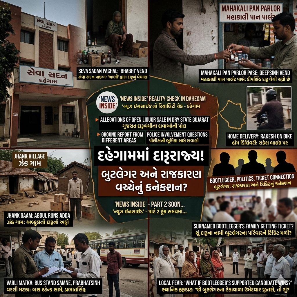 દહેગામ: ગાંધીનગરના દહેગામમાં ‘ન્યૂઝ ઇનસાઇડ’ની ટીમે કરેલા રિયાલિટી ચેકમાં જે દ્રશ્યો સામે આવ્યા છે, તે ગુજરાતમાં દારૂબંધીના દાવાઓની પોલ ખોલી રહ્યા છે. દહેગામના જાણીતા બુટલેગરોના પરિવારના સભ્યોને રાજકીય ટિકિટ મળવાની ચર્ચાઓ વચ્ચે જ્યારે અમારી ટીમ ગ્રાઉન્ડ ઝીરો પર પહોંચી, ત્યારે સ્થિતિ અત્યંત ગંભીર જોવા મળી હતી.