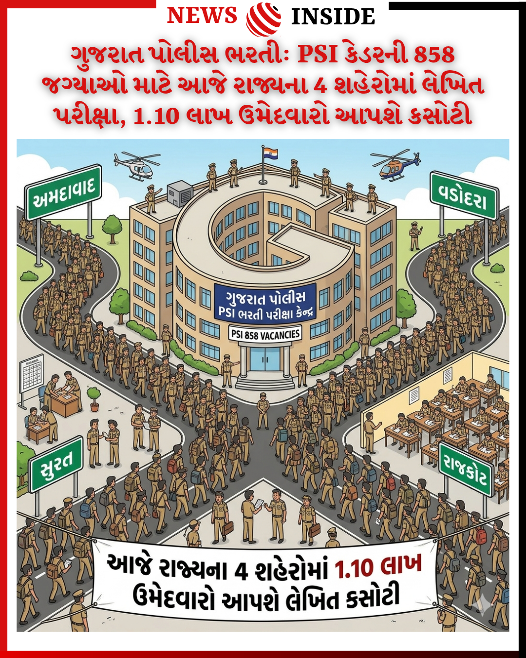 અમદાવાદ/રાજકોટ: ગુજરાત પોલીસ ભરતી બોર્ડ દ્વારા હાથ ધરાયેલી PSI (પોલીસ સબ ઇન્સ્પેક્ટર) કેડરની 858 જગ્યાઓ માટે આજે રવિવારે રાજ્યના ચાર મુખ્ય શહેરોમાં લેખિત પરીક્ષાનું આયોજન કરવામાં આવ્યું છે. શારીરિક કસોટીમાં ઉત્તીર્ણ થયેલા કુલ 1,10,680 ઉમેદવારો આજે પોતાની બૌદ્ધિક ક્ષમતાનું પ્રદર્શન કરશે. પરીક્ષામાં કોઈપણ પ્રકારની ગેરરીતિ ન થાય તે માટે વહીવટી તંત્ર દ્વારા ‘લોખંડી’ સુરક્ષા વ્યવસ્થા ગોઠવવામાં આવી છે.
