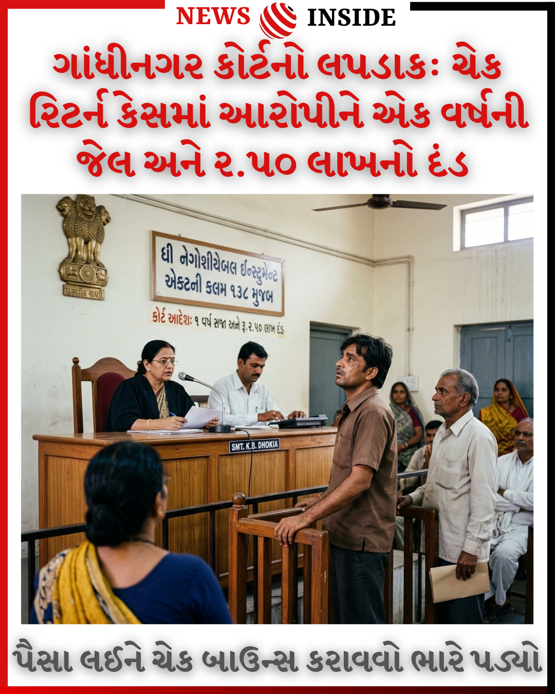 તાજેતરમાં ગાંધીનગરની કોર્ટે ચેક રિટર્ન સંબંધિત એક મહત્વના કેસમાં ચુકાદો આપતા આરોપીને જેલની સજા ફટકારી છે. એડીશનલ જ્યુડીશીયલ મેજીસ્ટ્રેટ શ્રીમતી કે.બી. ધોકિયાની કોર્ટે આરોપીને તકસીરવાન ઠેરવીને ૧ વર્ષની સાદી કેદની સજાનો હુકમ કર્યો છે.